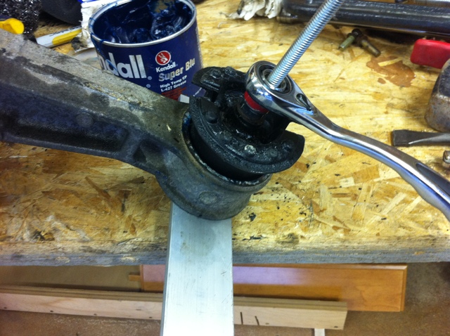 The new mounts obviously didn't want to slide in so I drilled a hole in a piece of aluminum and ran a bolt through it with my fancy ratchet.