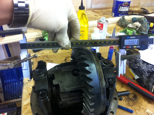 Then you must check the bearing preload. There are four points on the bearing caps and the preload is measured between these points. You measure the tabs diagonal from each other. The preload must be (7.3004-7.3031). I aimed for 7.3025.