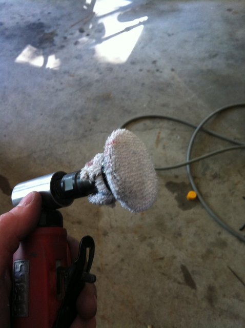 After the heavy cutting was done with the aluminum bit and a number of sanding discs I moved on to a 220 grit wet sandpaper by hand. The polish by hand was getting to be a real pain so I made my own out of folded paper towel and an old sock zip tied around an old sanding disc.
