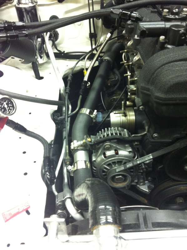 For the coolant reroute I wanted something clean and reliable. I went and picked up the 2002 Tahoe radiator hose that most people use, then I chopped it up. You can see that there is hard pipe in the middle- that’s actually my old recirculating valve hard pipe, just so happened to be the right size for the job.