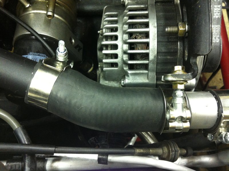 Then I used a slight elbow and mounted it to the alternator bracket using a t-bolt clamp. I have had my tension set bolt removed for months so this was convenient. I used locking nuts with loctite. The assembly sits here comfortably with it unbolted but this was just for some added insurance.