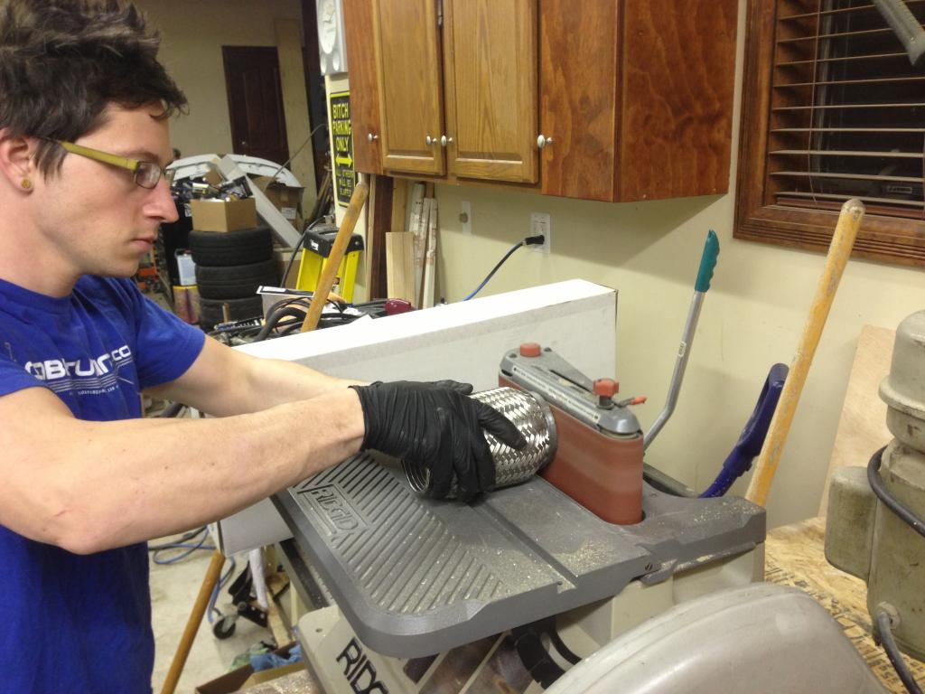 I started with the downpipe – Leaving my V-Band to turbo flange slightly loose to allow for some rotation while mocking up the rest of the system. I wanted to start out with the flex pipe to keep stress off of my manifold. I had to knock some of the stainless wire off of the end of the flex pipe and then I mated the V-Band flange to it for a couple of quick tacks.