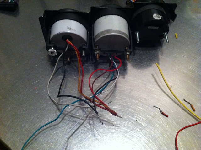 Did some very minor wire prep last night. I'm using a couple of Marshall gauges for my Oil PSI and a Boost gauge. The gauges are tinted faces with Amber and White LED illumination. They have two feeds for these Illumination options so I'll use the other for an input to signal when my METH pump is on. I do have the AEM monitoring system with the flow gauge but it's easier to see these light up out of the corner of my eye.