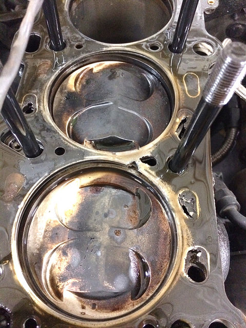 Seems to me that they may have been blown through when the first cylinder to coolant passage was made by the gasket failure. I have to imagine the material was hot and more playable and the increased pressure might have been enough to blow through it.