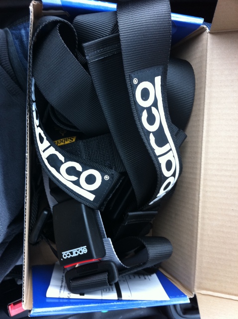 New toys I picked up last week.. I'm not a fan of my factory belts rubbing over the shoulder of my suede seat. Eventually it will wear and start to look like ish- So I grabbed the Street Tuner belts from Sparco. It's still a 4 point belt but it has a more daily-friendly-buckle instead of the turn buckle deal.