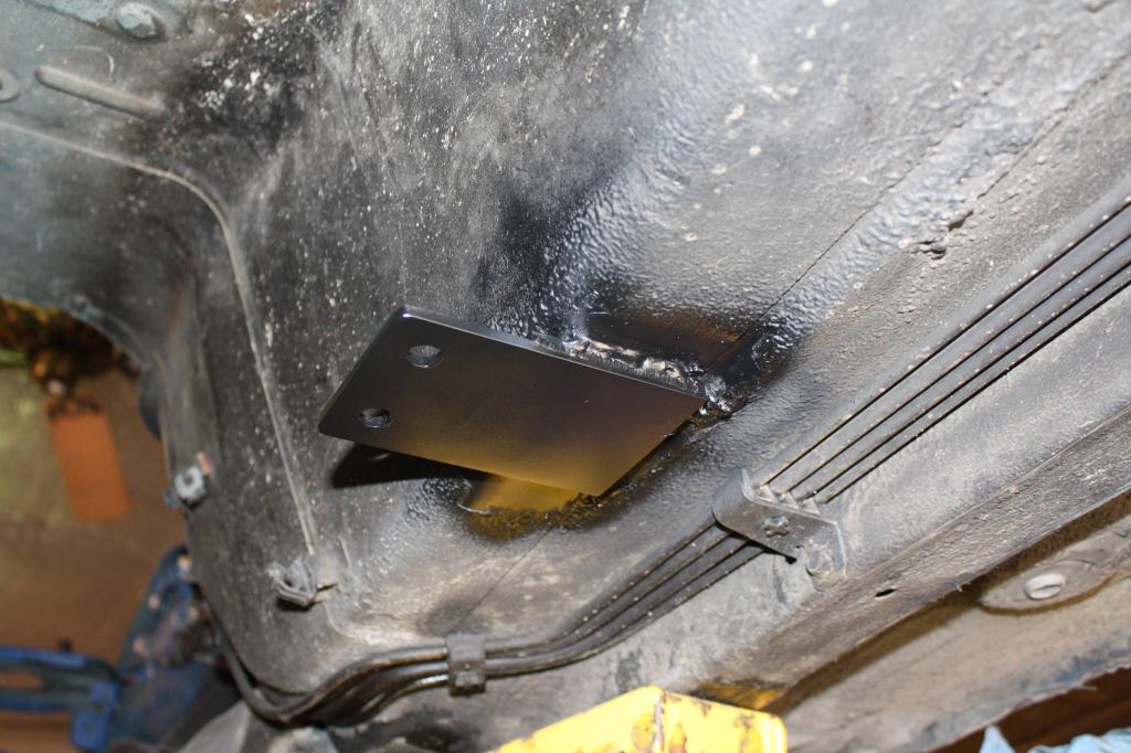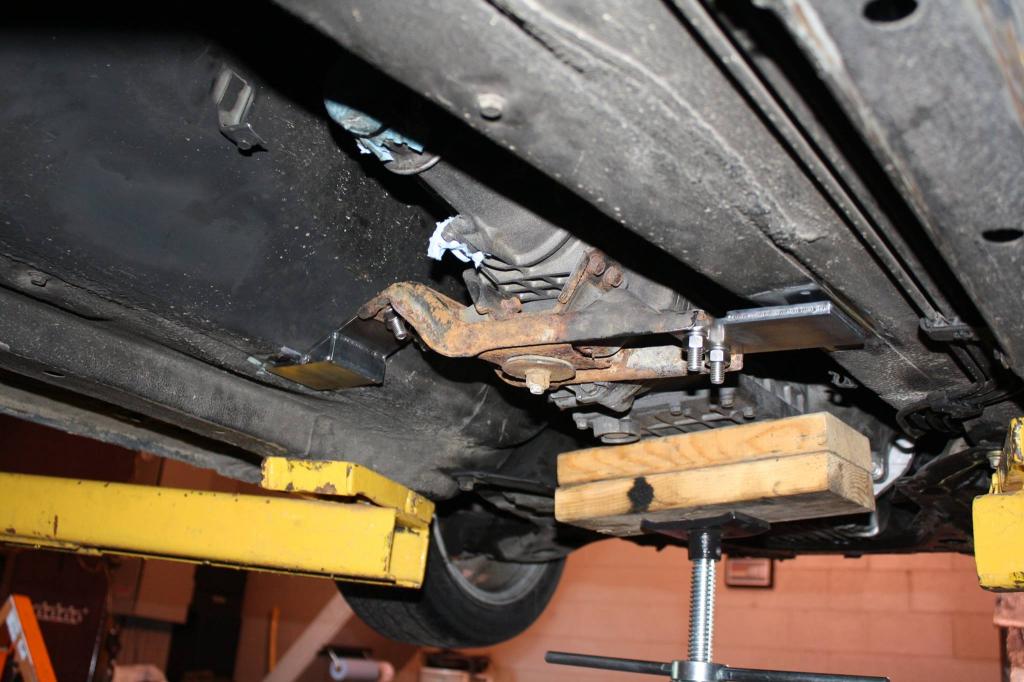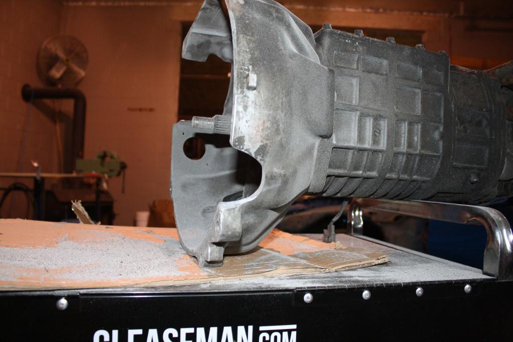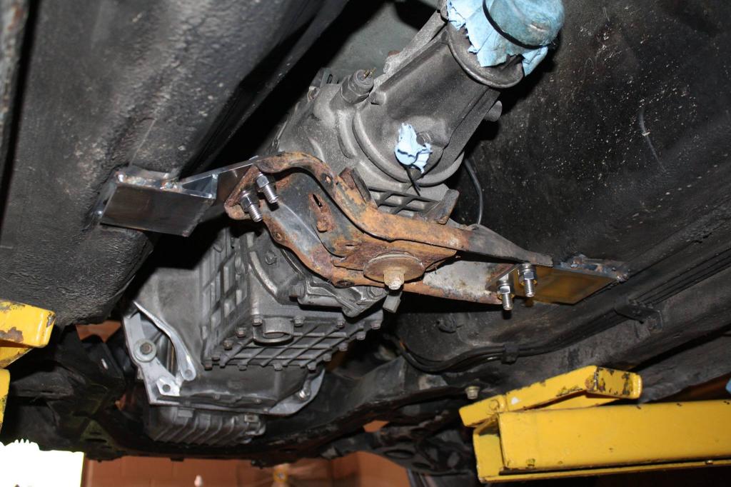 Trans mounted with all stainless steel hardware. That nasty crossmember is going to be sandblasted and painted or powdercoated for the final install.