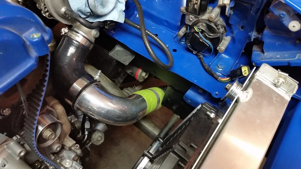 In my last update I started mocking up intercooler piping while I waited for a coupler. Well that was a waste of time because after I got the coupler on there the pipe I made up didn't work, but the same general idea would work so I made a few more cuts and got a new pipe mocked up. Seemed to work out alright.
