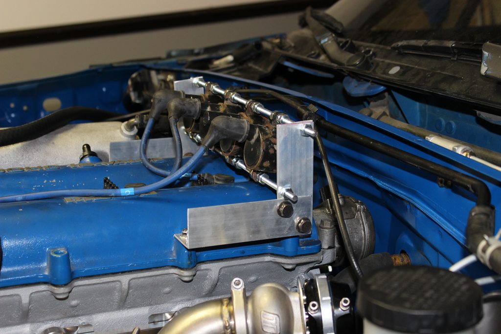 Next up was finding a way to mount my LS coils. I originally wanted to mount them along the intake side of the valve cover but didn't have the tools to make a mount like that look as good as I would have wanted. Decided to go with this setup. I'm still kind of on the fence about it but it seems to do the job pretty well so I might stick with it. Any comments/suggestions welcomed on this mount. It cost me under $10 since the girl working at the store forgot to scan out a bunch of the aluminum and threaded rod I got.