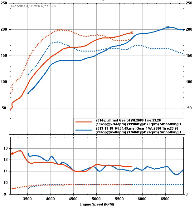 This is a pull vs my previous best. EDIT: I am running VirtualDyno uncorrected numbers so this is pretty close to what Blaen99 is seeing with his Precision4828 as well with the same boost level.