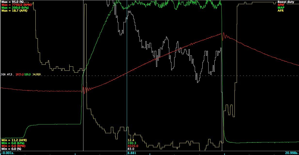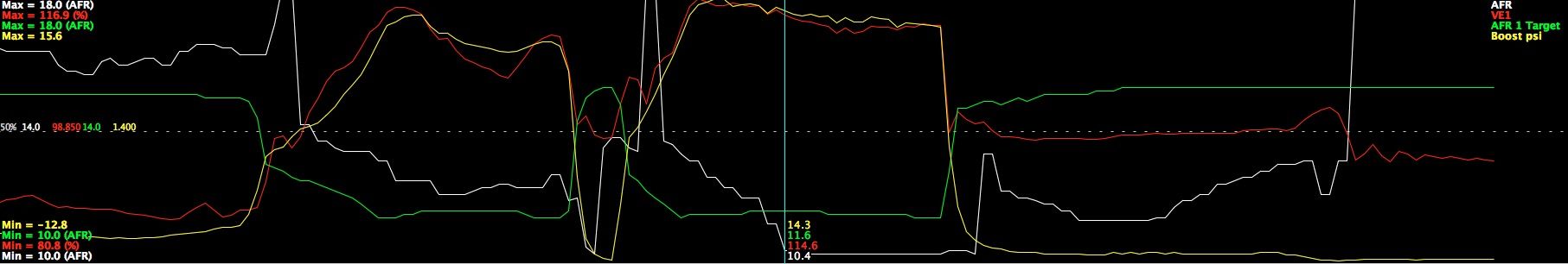 EDIT: Also take a look at my VVT on the two "pulls." On one the VVT sticks close to target and my AFRs are fine. On the second pull the VVT sticks at about 4% no matter what duty it is being fed. Strange.