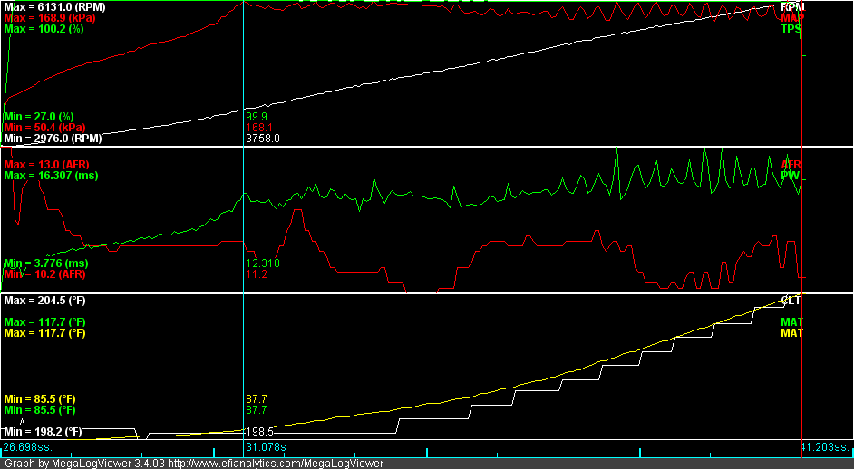 • My AFRs were taken to 11.1 EVERYWHERE in boost until they got close. When I get the timing trigger verified I will drop in the AFRs from my original map and let it readjust.