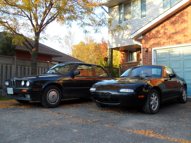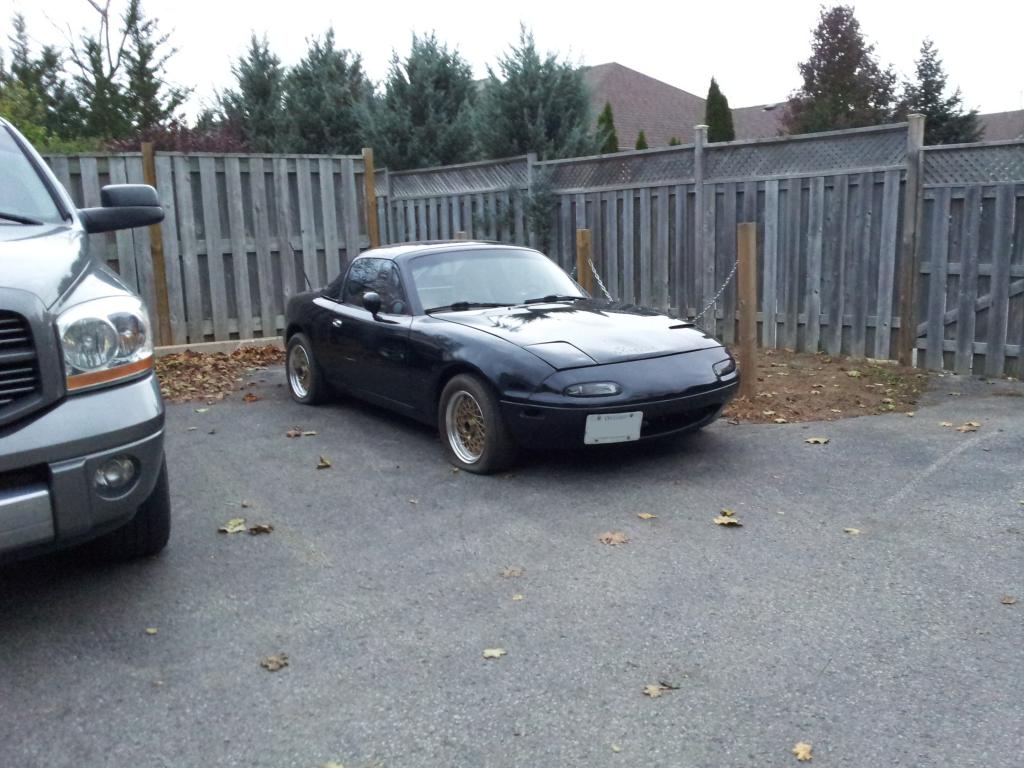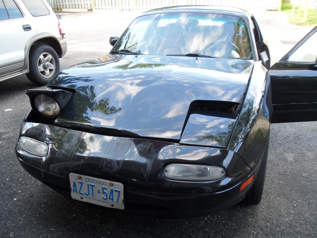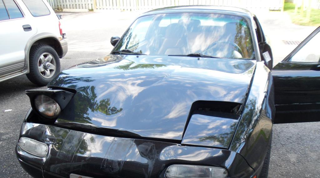 Tires are garbage but just threw it on the Miata to roll around on. Will probably transfer Apache's to E30. Bent hood back as best as I could and threw new bumper on (eventually replaced hood with a slightly scratched OE alum & black one):