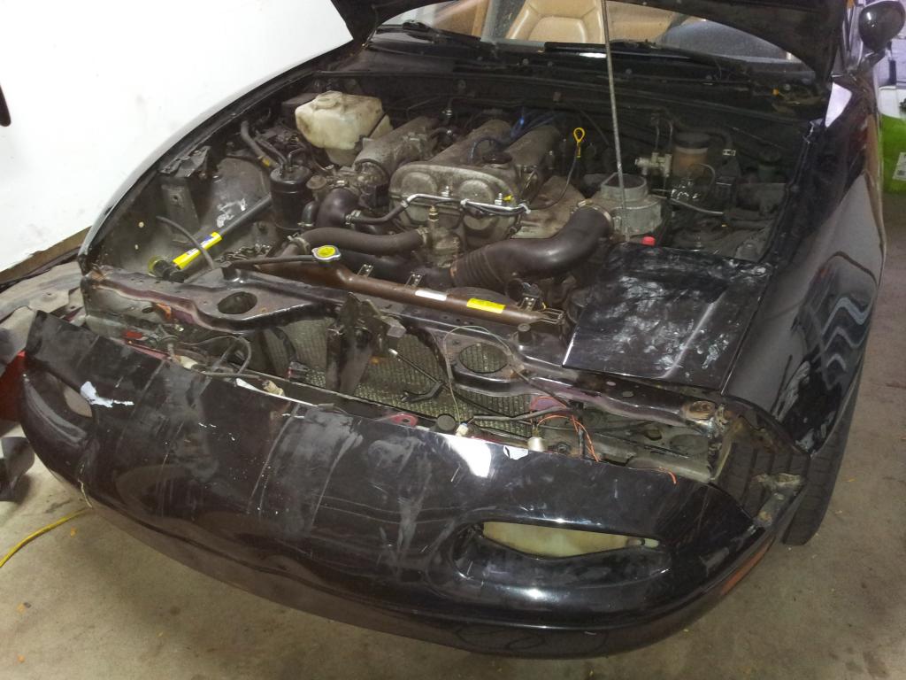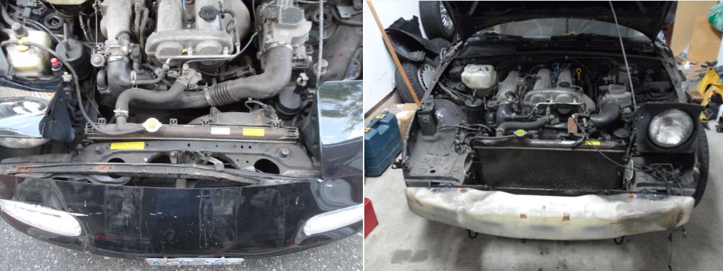 Around the same time, someone locally understeered and flew off an off ramp into a ditch, so he was parting out. Score. Cut out their rad support and snagged the bumper (WHY ARE THERE SO MANY RED MIATAS!) and welded new support on: