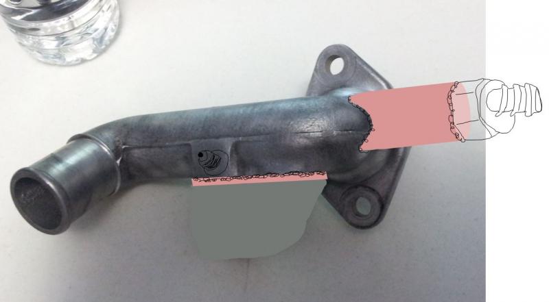 - Grind off stock oil cooler water port, fab up 1" tube to mate to neck bend by flange and machine tube ID to mate with -10AN weld on bung register. Install another push on hose connector and run a slight 'S' in the hose to mate up to stock HC return pipe