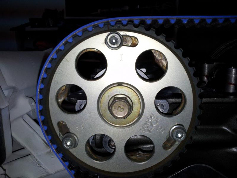 - Tonight I clocked the exh gear ~120 and re-aligned cam gears using the dimples as my reference and positioned dimples upright (see below)
