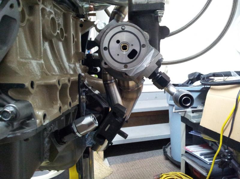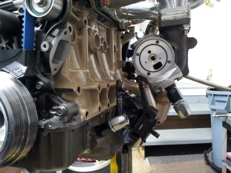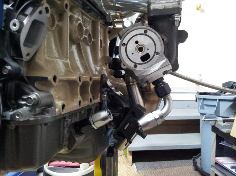 - For now, best I can come up with is maybe I can clock a 90* from the turbo pointing forward and then let the braided line 'S' its way back to the straight oil pan fitting like below: