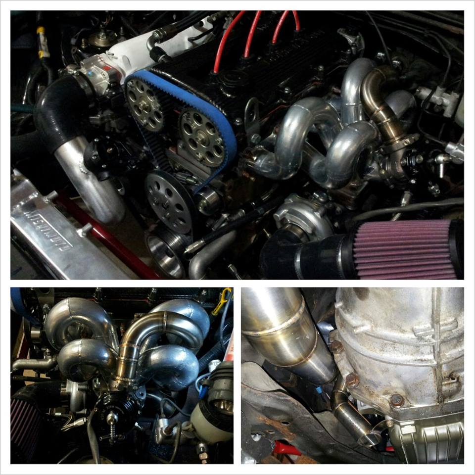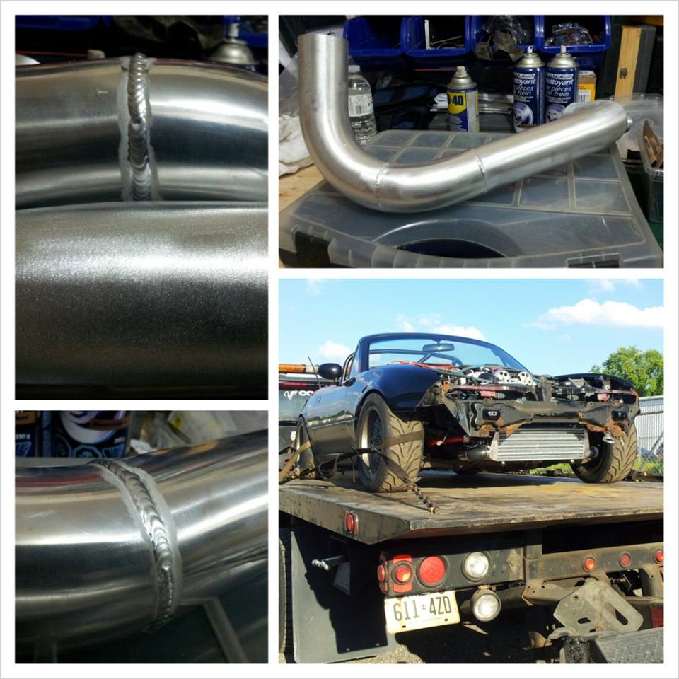 Towed it to a shop to get intercooler tubing all welded up. It was at this point I realized my brake hard line to flex line area on the FR RH burst while I was prying a bit on the fuel lines... BMC reservoir was all dry fml. Nonetheless, was happy with the tubing: