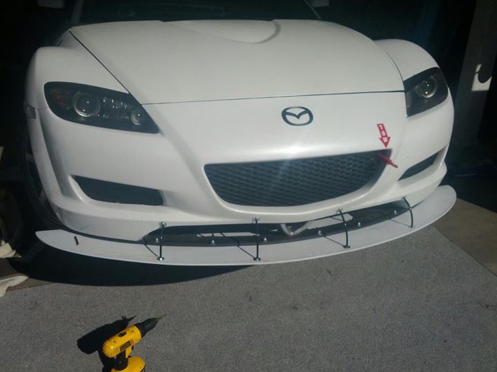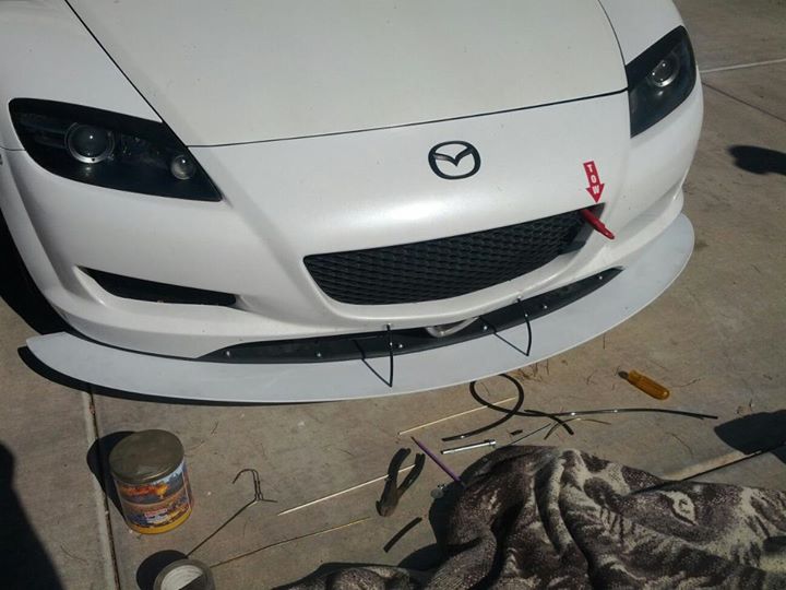 Started working on supports. The splitter is attached to the lower bumper lip with bolts, and then I used threaded rod and fender washers/nuts to secure it. I bent the threaded rod around a coffee can and then covered them with plastic sheathing.