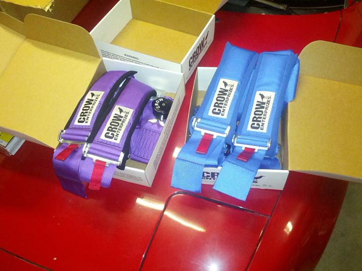 Anyways. I got some Crow Enterprizes 6 point harnesses with sewn in shoulder pads. Purple is for the RX-8 and blue ones are for the Miata.