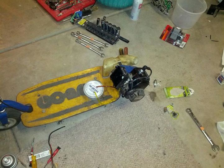 Kind of a little side adventure here, but getting around at the track in the pits was getting annoying just being on foot all the time, especially at larger tracks. I would see everyone zipping past me on small pit bikes and gopeds and bicycles etc, so I picked up a non-running GoPed Sport that is very portable and easy to use for 80 bucks from a friend. After putting about 160 bucks into it (I got a little carried away) it was set to go. All you have to do to start it is jump on and push since it is a direct drive spindle driven type, if the motor is running the wheels are turning.