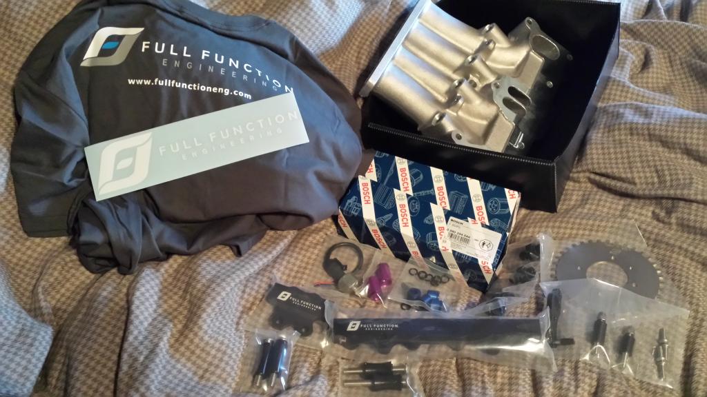 I got the electric water pump plate that I bought from a fellow 8Club member (VICEdOUT) and there was even something extra in the box! I've never gotten bonus parts gifted to me before LOL! It was a set of stock fuel rails that have been modified to use an external regulator and -06 AN fittings. Might be able to put it to good use, we'll see later on down the road.