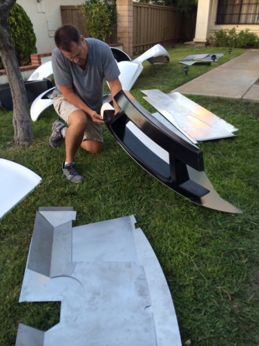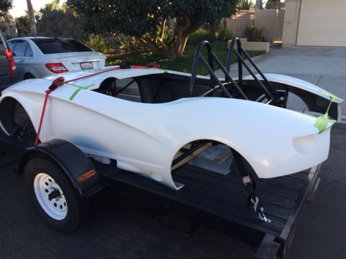 About 30-40 sleepless nights after putting down the deposit Cord delivered the frame and body. Jay, Cord and I were easily able to carry the frame off the trailer (which I believe weighs about 225 lbs). We were able to drop it right on the roller skate and I instantly had a rolling chassis. The fiberglass body is also insanely light and I can easily carry one entire side of the car with one hand. Guessing all 5 parts of the fiberglass body weighs less than 100 lbs total!