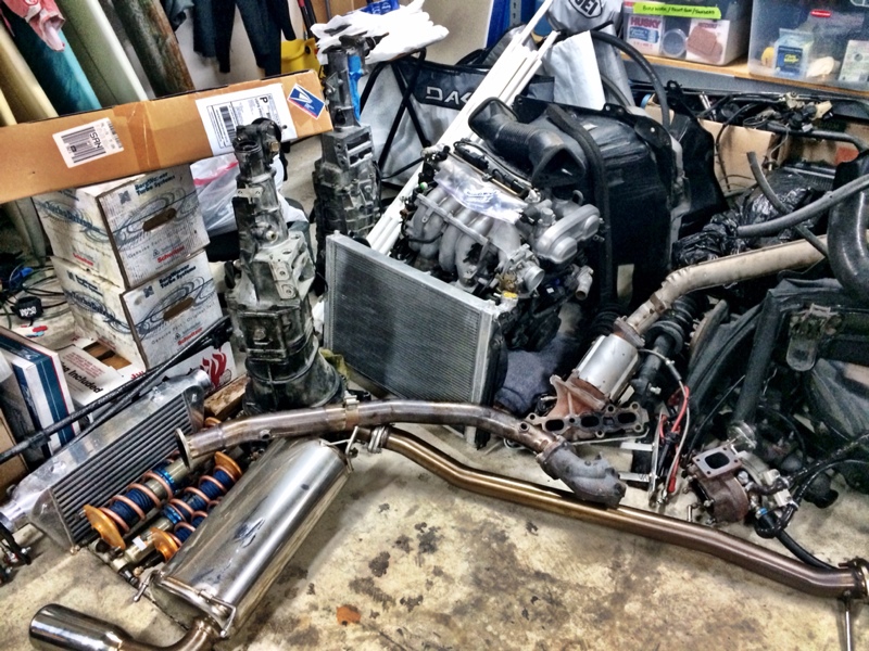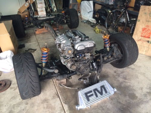 Well that “some point down the road” ended up being about 2 days after I picked up the donor pack. I was shopping around for the last couple things I needed on Craigslist and stumbled upon a NA track prepped car just a few miles away. The engine was in bad shape but it was a perfect situation because that was the one thing I didn’t want. I kept the wheels and the new R888 tires, the FM turbo kit with the Hydra Nemesis, the FM happy meal, the Ohlin adjustable suspension, the Willwood big brake kit, and a bunch of other performance items. I then parted out the huge list of extra stuff and all of a sudden my “stock” Catfish had just about every performance upgrade I had hoped to eventually get! A little luck, a lot of determination and a few sleepless nights have shaped up to be the beginnings of a pretty killer build.