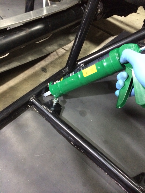 One important (and boring) step that needed to be done was to seam seal the floor panel and the frame. This will help cut down on noise and vibration, and protect the floor from water and moisture. I used DAP clear flexible gutter and roof sealant from Home Depot which was better and less expensive than automotive sealant.