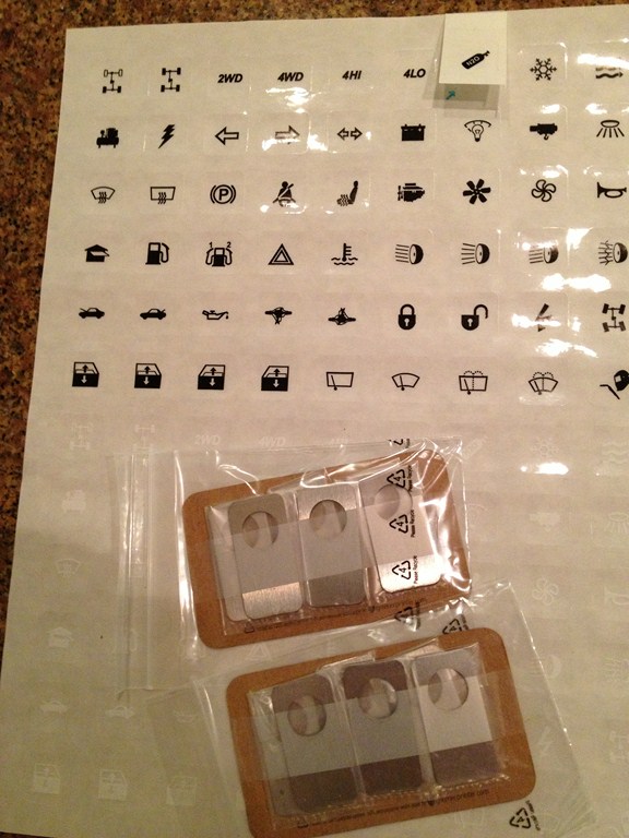 Check out this neat little stuff from Auger Resources (Auger Resources Automotive Accessories). It's a stainless steel toggle tab that universally fits all 1/2" toggle switches. Just add the tab, and then peel and stick the right icon to go with the toggle. The icons include everything from lights to seat heaters, and everything in between. I think a few will be going on the Catfish.