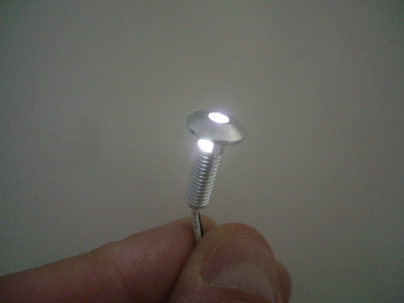 1) LED lighting screw--this is patent-pending M5, M6 or 1/4-20 screw. The screws are machined, gun-drilled, and then a slot is milled under the head. A tiny (TINY!) printed circuit board is then installed, which includes not one but two micro-LED's. You can see the result when lit. The cool part is when you install them on glass or a motorcycle windscreen, as the edges light up. When done right, you can't even tell the light source.