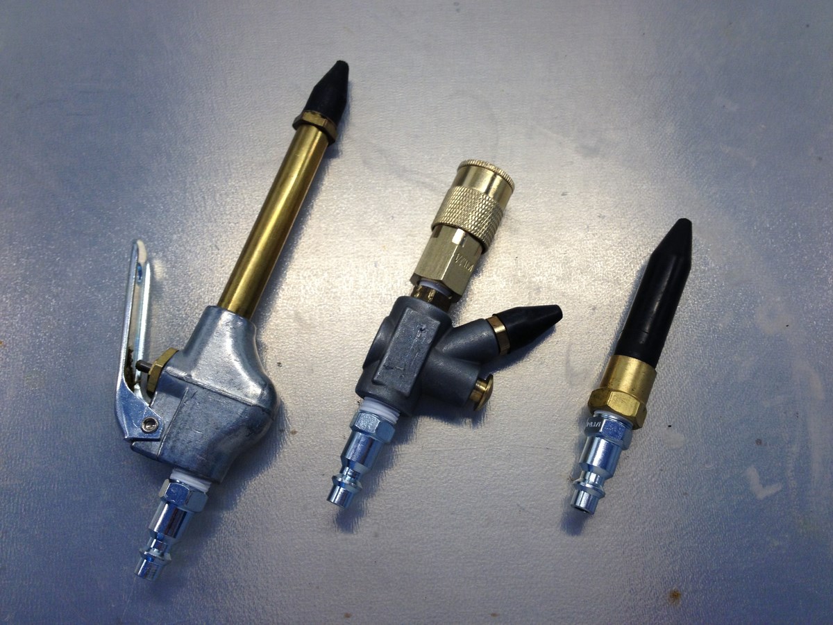 --In-line blower--use with grinder to instantly clean off your project, without having to stop and change tools. It's got a quick-disconnect on top (grinder on top) and a 1/4" male connector below for hose connection.