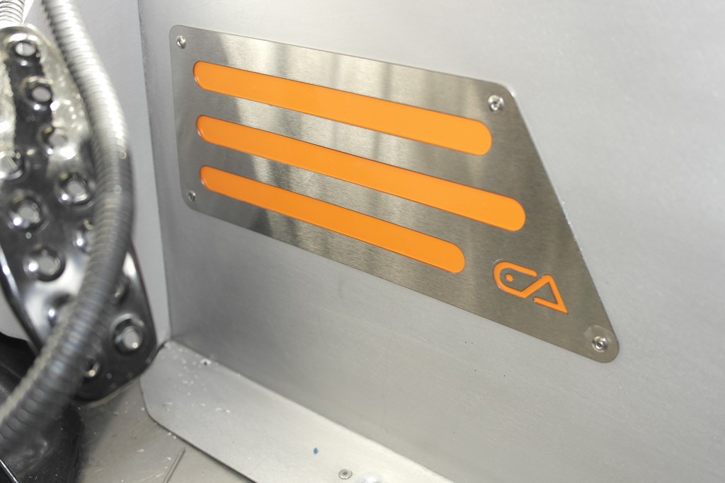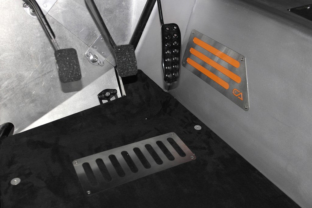 Competition Werkes make a stainless kick plate and heel plate. The heel plate was installed over the microsuede flooring for wear purposes, and the gas pedal kick plate is there to prevent scuffs on the tunnel.