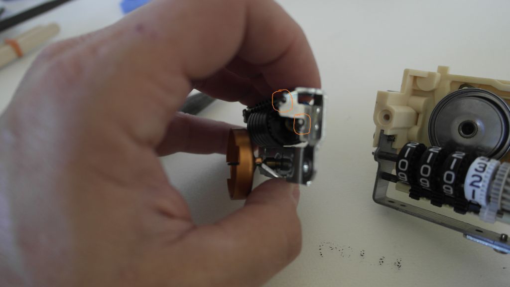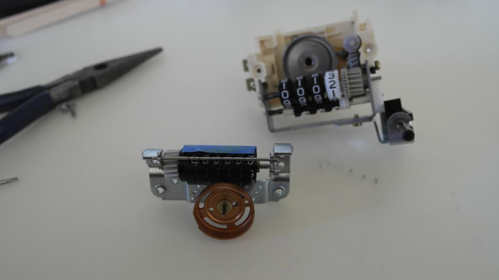 In case the pictures aren't clear, the odometer tumbler needs to be removed from the assembly by bending the tabs that hold the "stopper bar" and the axle of the odometer. Hold the cage on the outside of the odo with your left hand, leaving the mile digit and cage free to rotate. Turn the odo with by the gear. When mile digit hits zero: