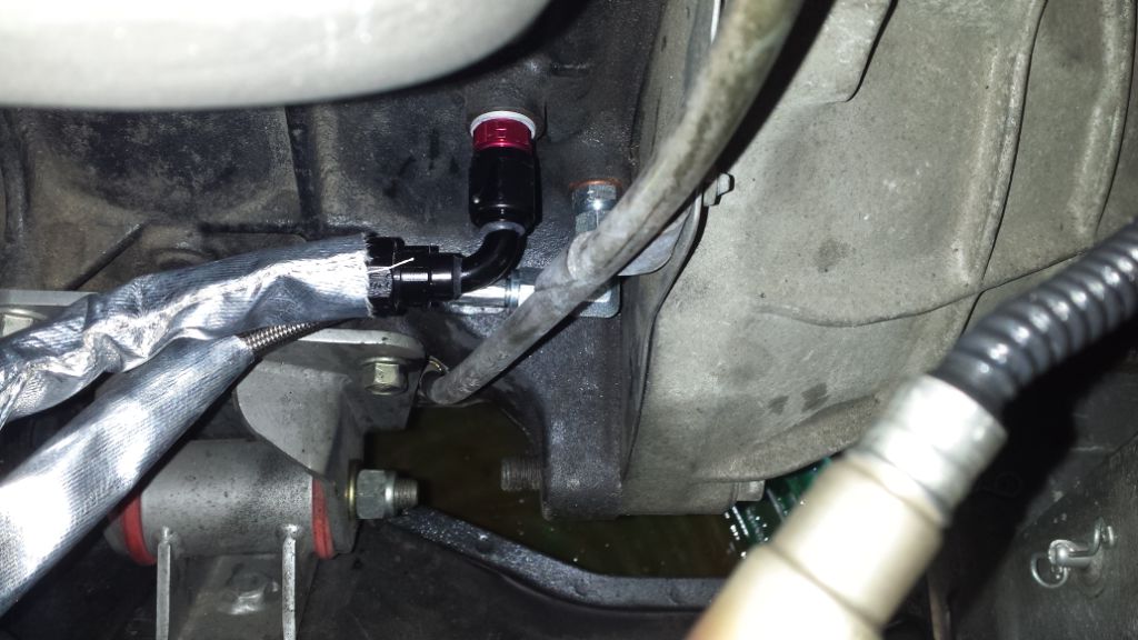 With the current setup at the front and back of the block, the water wouldn't really flow until the thermostat opened up, even though I've opened up the weep holes in the thermostat a bit. So I decided that since Mazda was kind enough to leave an oil and water galley open for use, we'd use it. So standard setup, no problems.