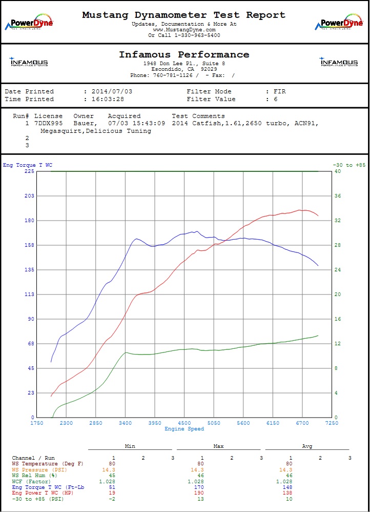 I spent the entire day in Escondido today, dynoing the Catfish. It was hot, muggy and the car seemed to do well anyway. The dyno is owned by Mike at Infamous Performance in Escondido and the tuner is William Knose of "Delicious Tuning".