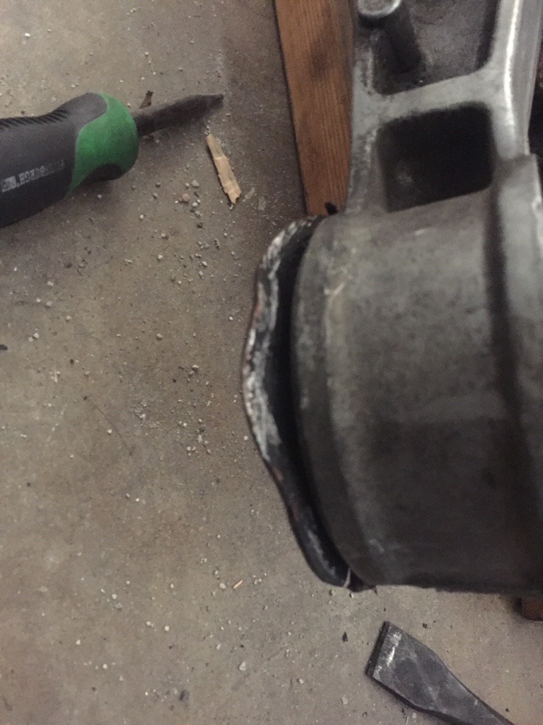 Once that was out I started hitting the edges with a chisel and hammer. Since the metal piece is actually 2 I just hit the one side until it came out. The other side followed rather quickly.