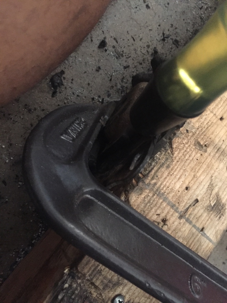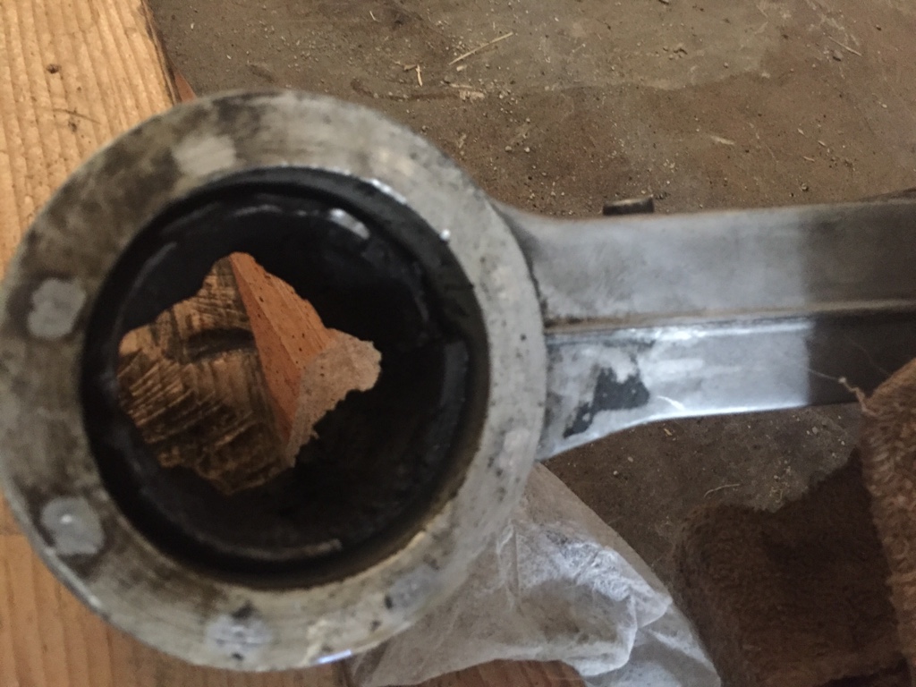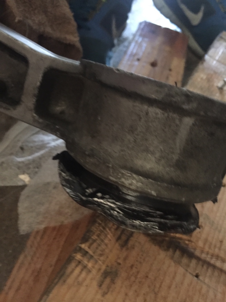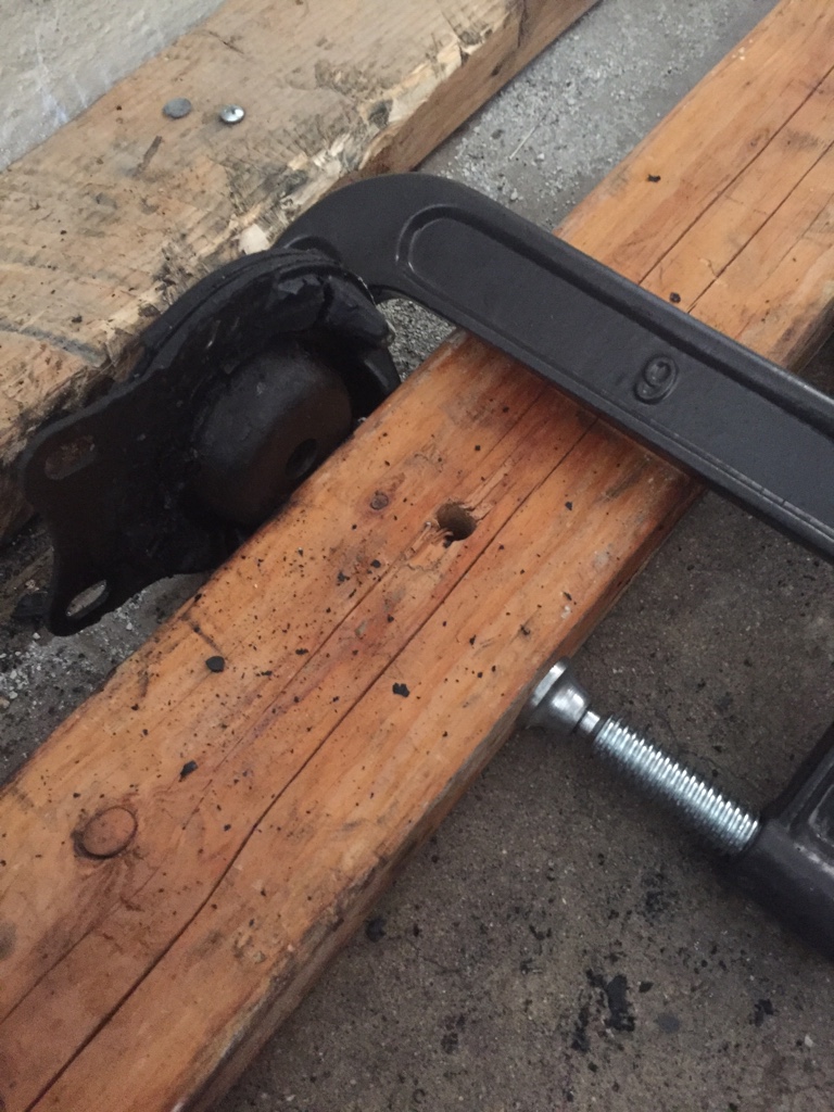 I was debating doing the other part of the bushings. After a few minutes of looking I found a way to involved heat to take the rubber off the other pieces but I didn't have anything to do that with. So I just made something up, takes a few minutes to get right but it's basically just clamped to some wood so I could hit it with a hammer and chisel at an angle to scrape it off.
