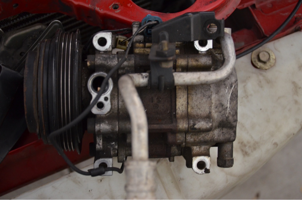 Once I replaced all the o rings, in the engine bay, I went ahead and started putting the compressor in. I knew it would be a pain since a turbo was in the way, so slowly but surely got it in, realizing from the bottom going up seems best. Then put the lines in connected to the compressor.