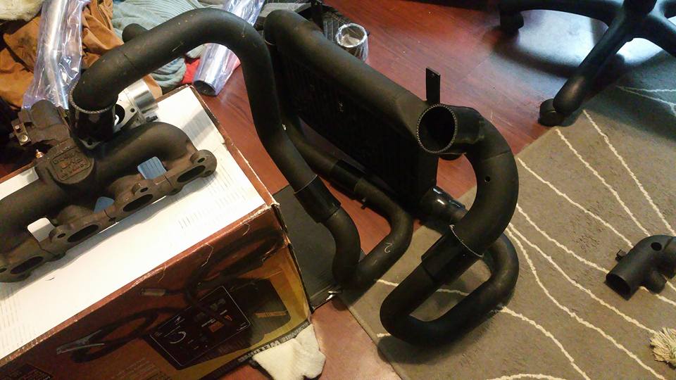 I picked up an FM1 Intercooler system from a local group member, not realizing that it was more setup for a 1.6 as the inlet manifold pipe was cocked and I tried mounting it up anyways. I don't like it and its not on the car currently. Its set up to have the bypass valve vent from in front of the compressor, and the bungs are set up for the kompact diverter, which I do not feel like paying $160 for.