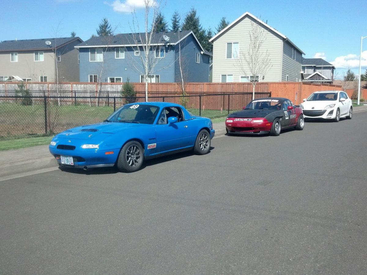 Woot, while working on the shitty miata my friends weighed mine. 2150 (that's with their weight already subtracted I'm assuming), with stock seats in. So 0-20lbs under 2100 in race trim. I'm not sure how much the license plate/floor mats/stereo/center console/registration packet/tools/etc weighs.