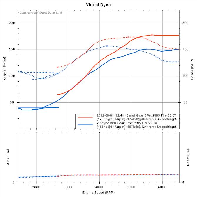 Part of this power jump is due to boost creep. The 2.5" run was a max of 8.4psi, where the 3" (again, without touching my MBC) creeped to 10.0.