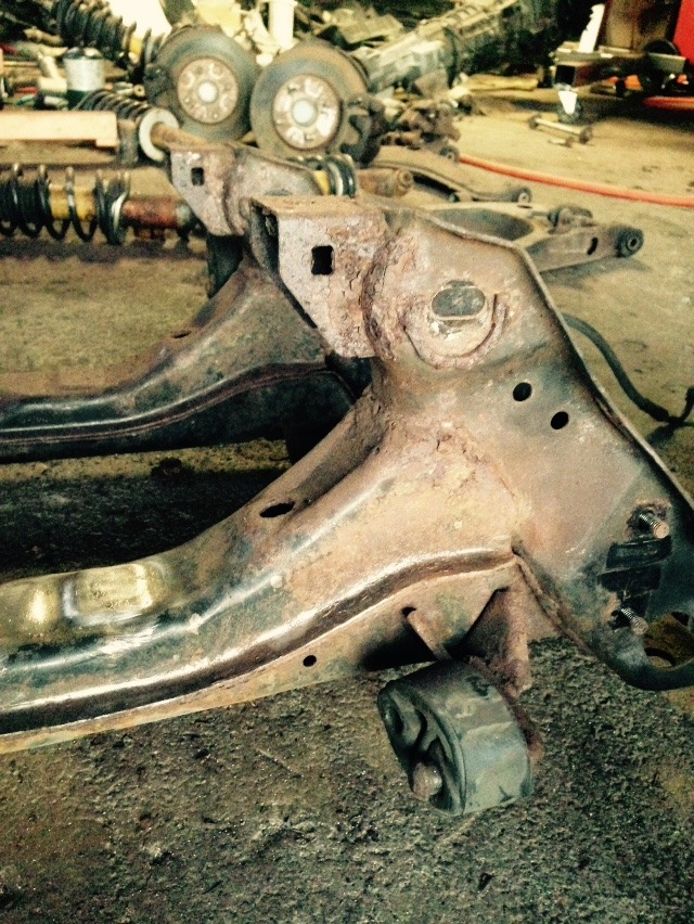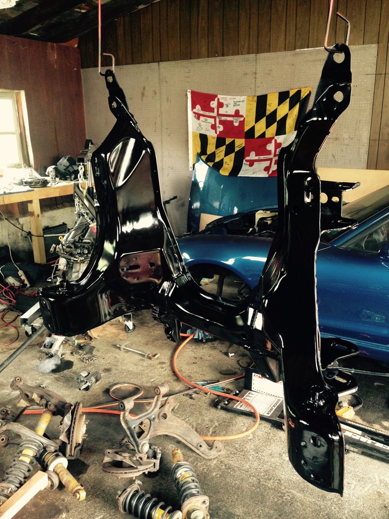 Good news is it was very cheap, bad news is that everything under the body is rusted to hell. Body is good, everything else I'm throwing out. That means cleaning up the spare parts I have off the parts miata (except for the rear subframe). I've gotten almost everything cleaned, primered and painted, just getting ready to rubber coat the bottom of the car to prevent any future damage. Here's where its at now.