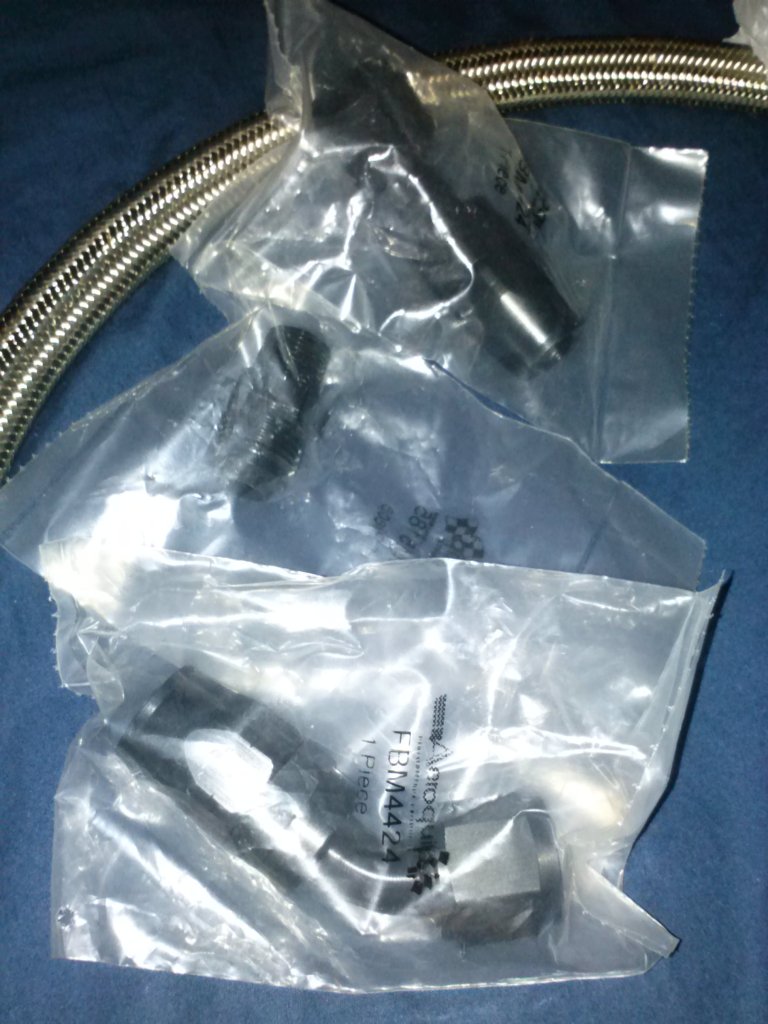 Order some turbo coolant Banjo fittings from ATPturbo. Picked up some 6an "NHRA Approved" coolant hose and some DEI cool tape from Summit Racing and made my turbo coolant lines. The clamps are 3/8" Fuel injection clamps