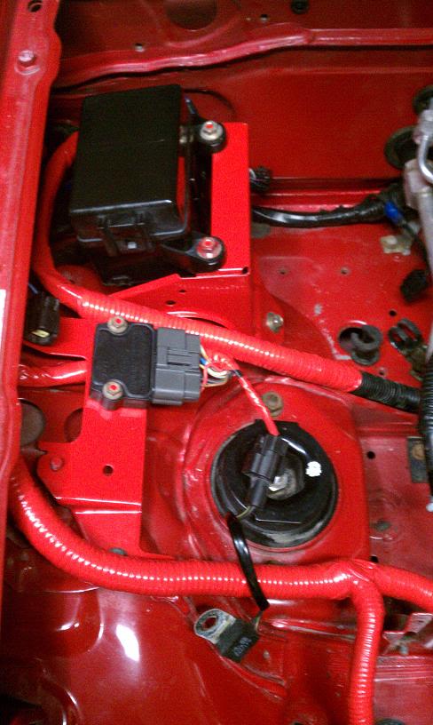 The wires were dryrotted and cracking so I tore the old stuff off and retaped them. I also powdercoated the brackets in an attempt to "hide" them and make the engine bay look a little less cluttered. The pictures don't reflect how well it blends in. I'm pretty happy with it so far.