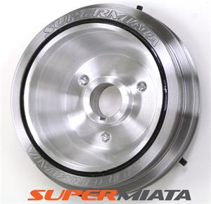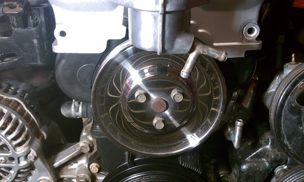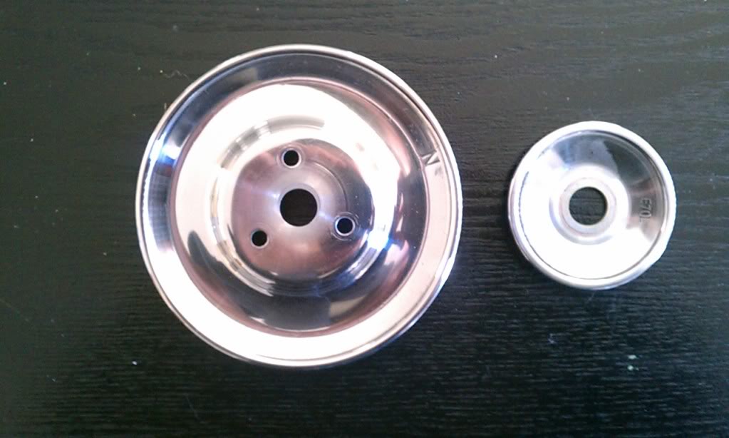 I think I'm getting a little carried away with polishing stuff. These are my water pump pulley and alternator pulley. Well, half of it anyway. I'll get to the other half later. The water pump pulley only took about half an hour. I cheated and bolted it to my bench grinder and just held different grades of sandpaper to it.