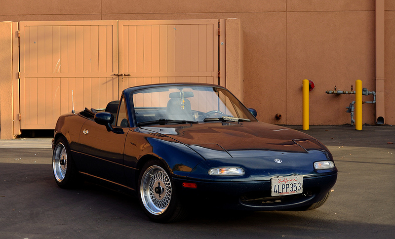 On February 2013, 95 NA Montego Blue miata. I loved the Miata platform so much and she was a bunch of fun. I bought her 15x8 Enkei 92 wheels and upgraded the suspension to some used Apexi N1 Coilovers which worked fine. I did a full tune up on her like every car I get. The previous owner did replace the water pump and timing belt with a bunch of other maintenance. It was rock solid car.