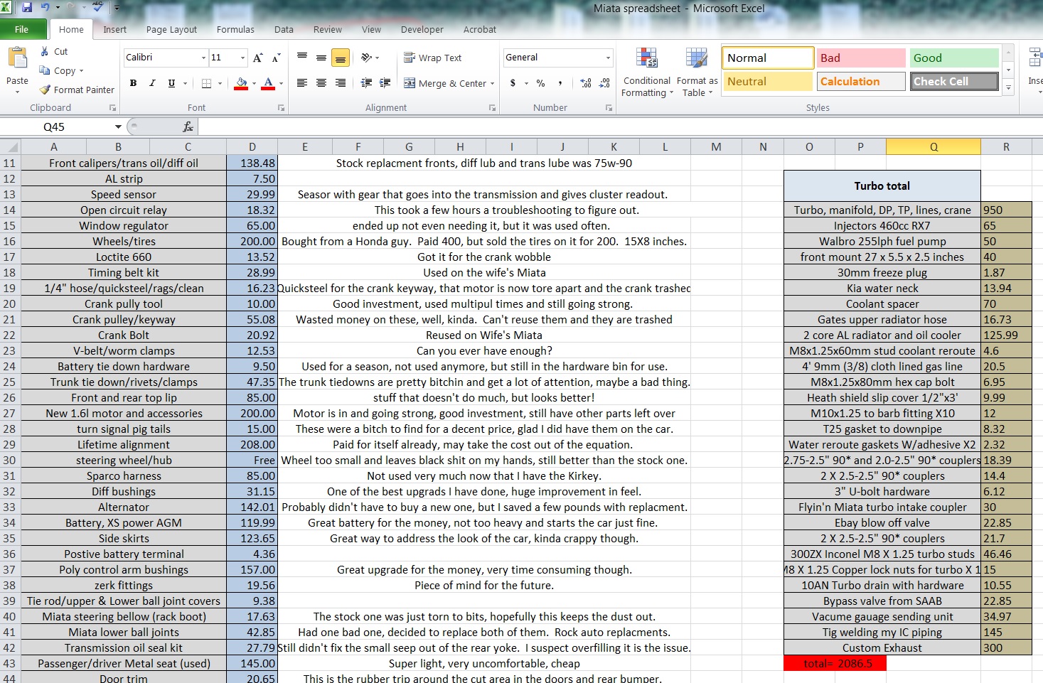 Anyway, I have also kept a tight check on all the turbo bits I have built and what I paid for them, albeit not in such a clean and organized manner.