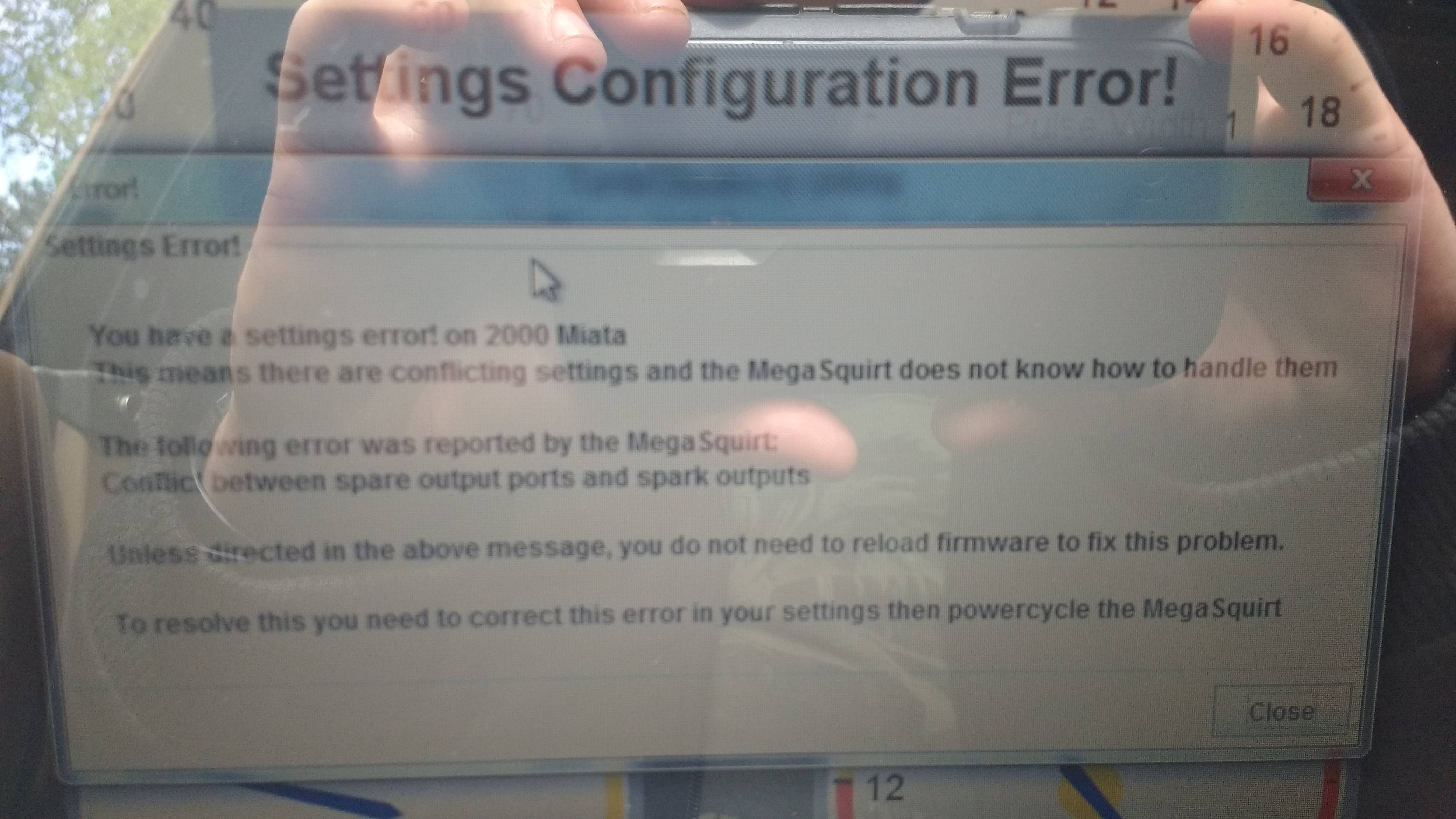 This means there are conflicting settings and MegaSquirt does not know how to handle them. The following error was reported by the MegaSquirt: Conflict between spare output ports and spare outputs.