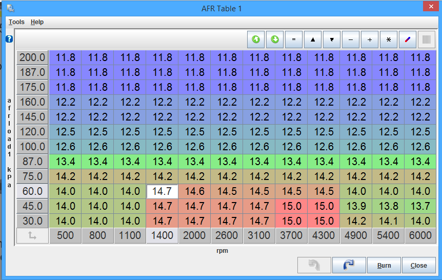 Back to just working on that idle. I can still crank it, but then it dies immediately unless I give it some gas. One thing I did note is that my AFR's stay at 10:1... that doesn't seem right to me, being VERY rich? Holding it at ~1400RPM, I would have figured it would be closer to 14:something to 13:1? The AFR table isn't set anywhere near that rich..