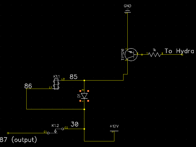 JS0 would be connected to your hydra, and the output leg would be connected to terminal 86 of the relay. Feed +12v to leg 85 of the relay and the banded end of the diode. Presto. Just make sure you have a transistor that can sink at least 1A.